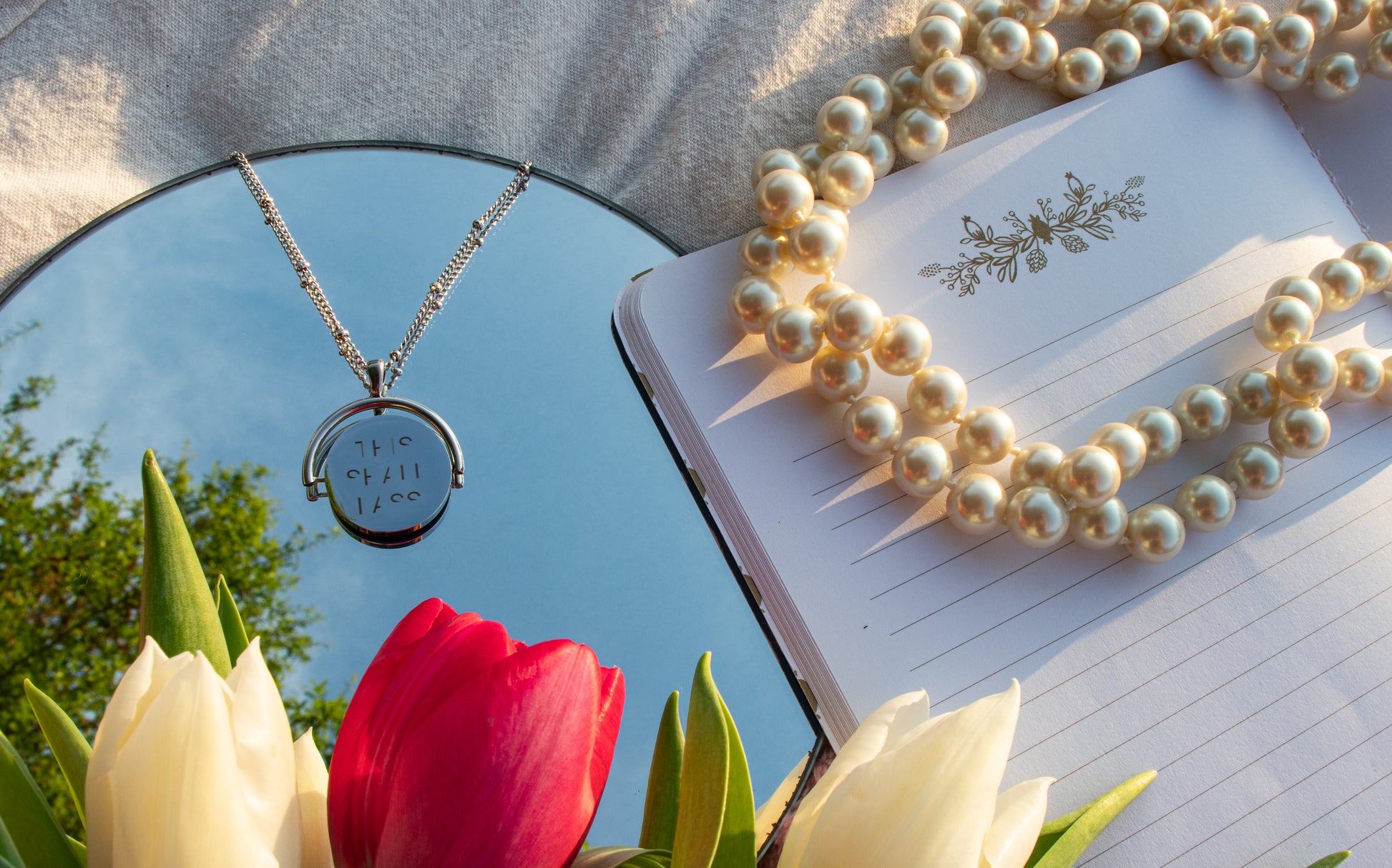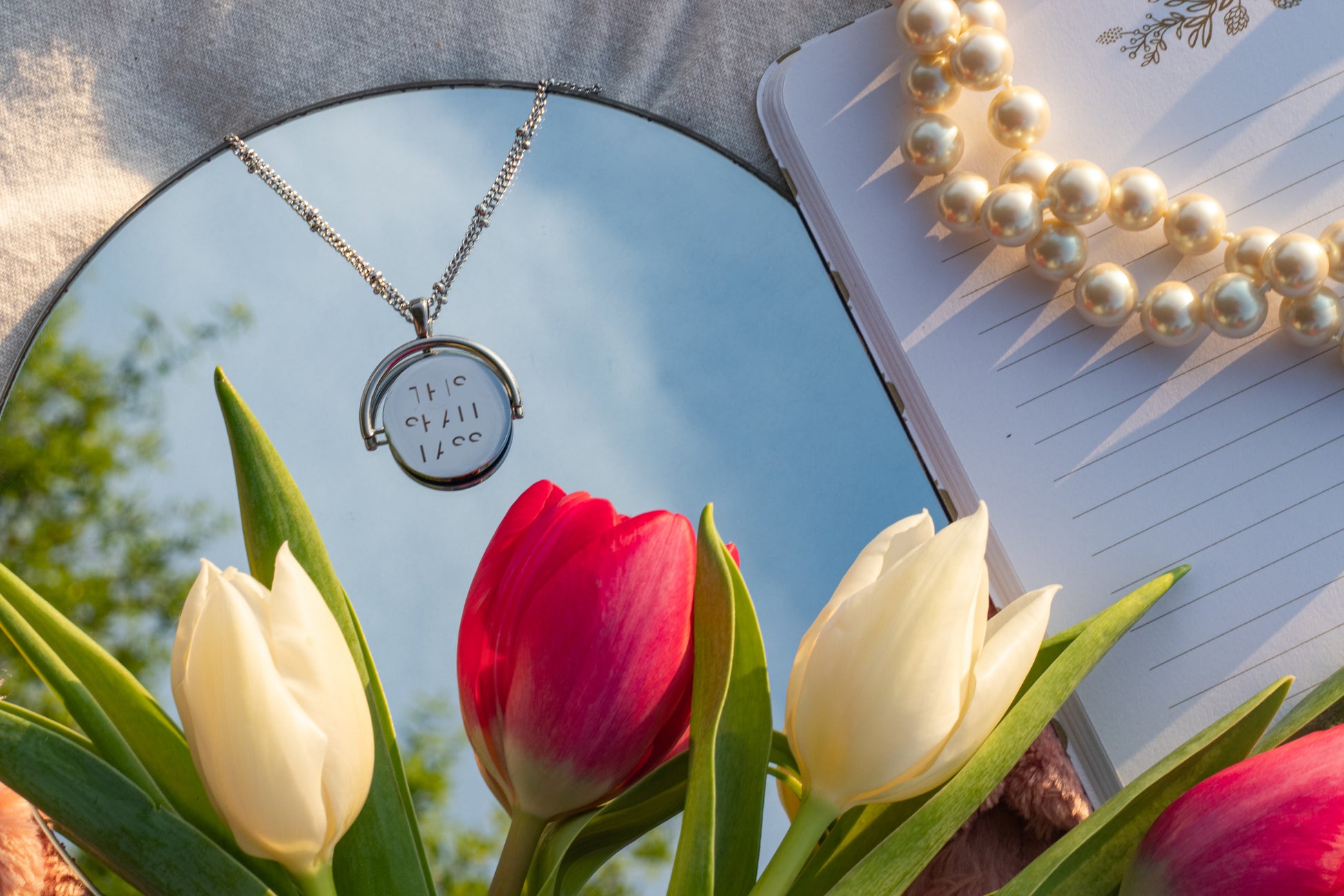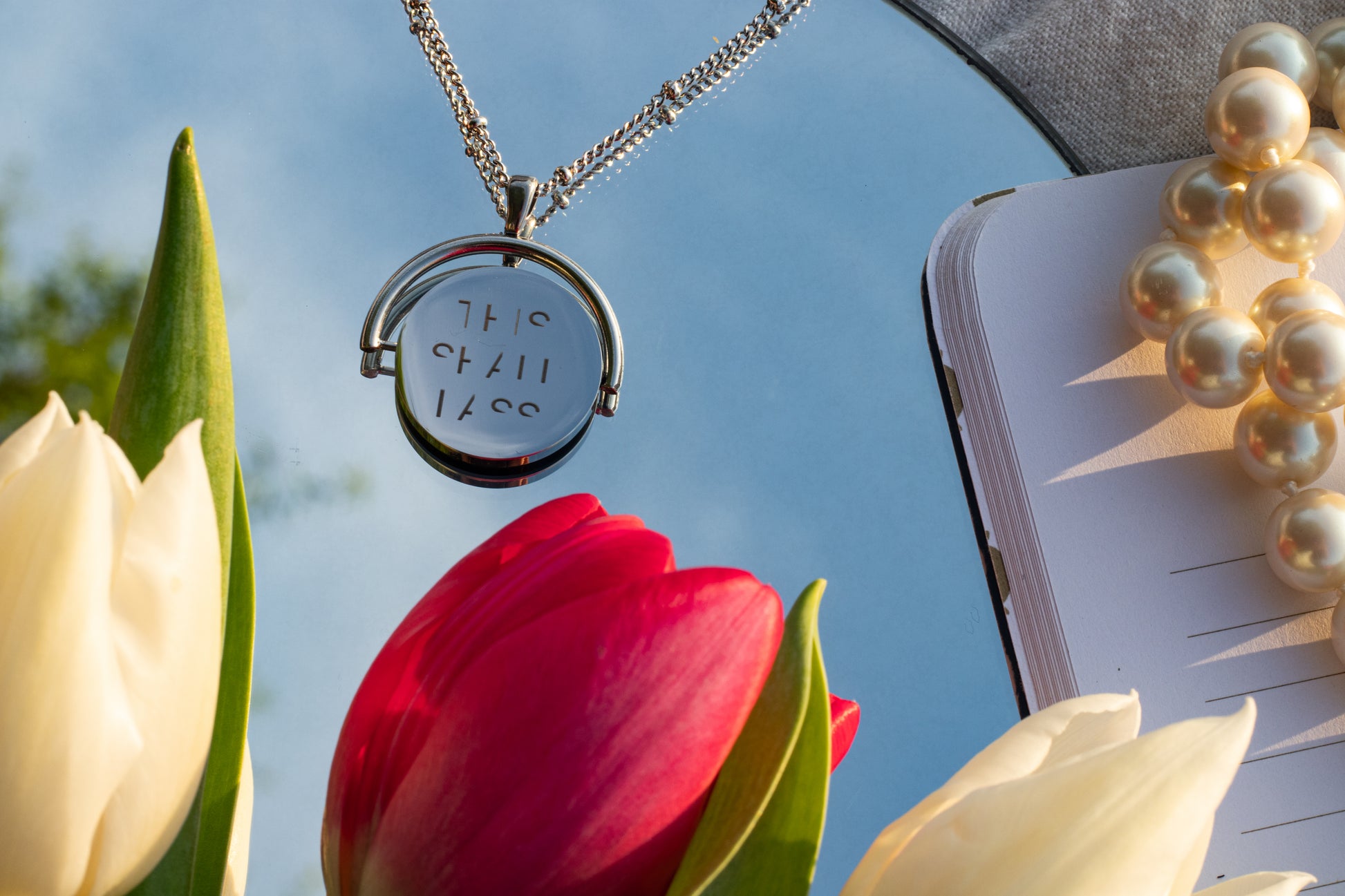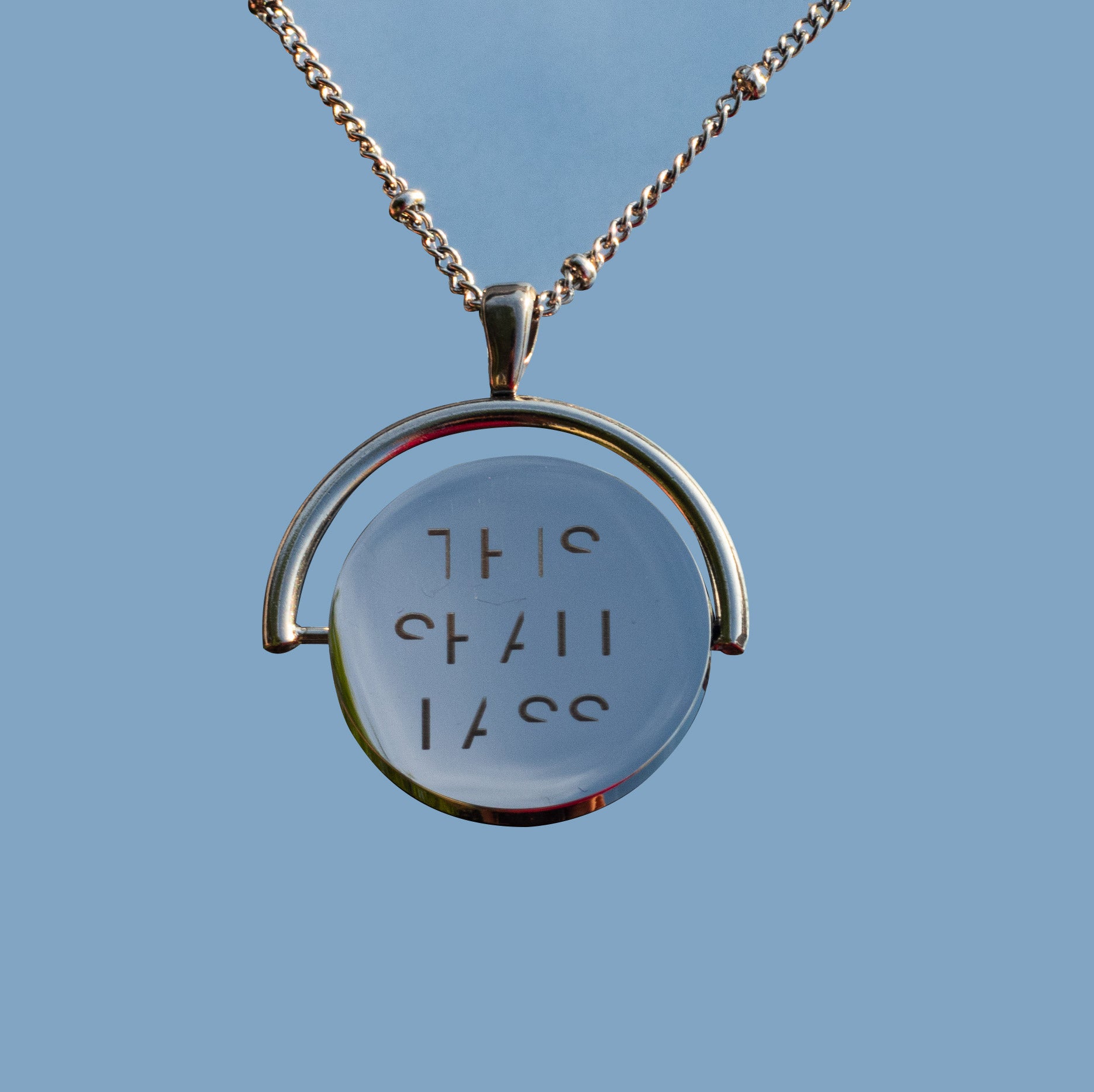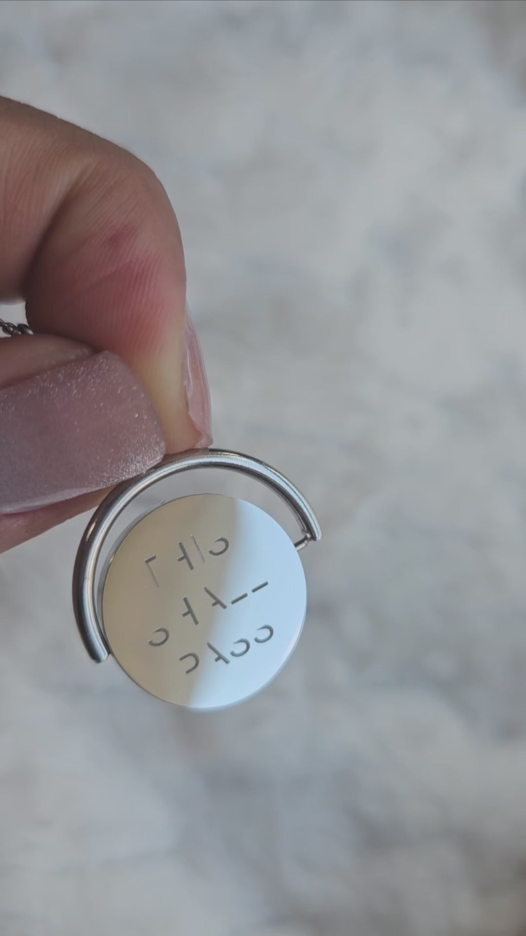 A beautiful stainless steel pendant and chain that features a hidden message and can be seen when it spins.