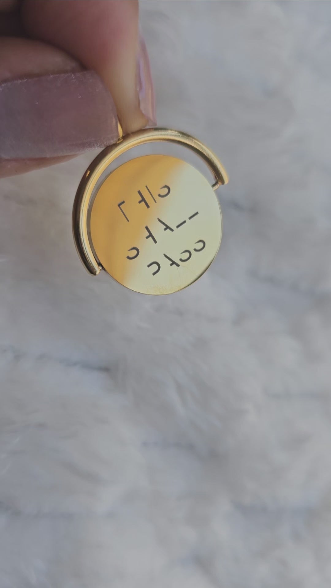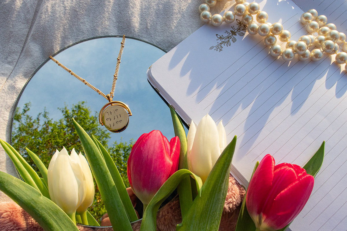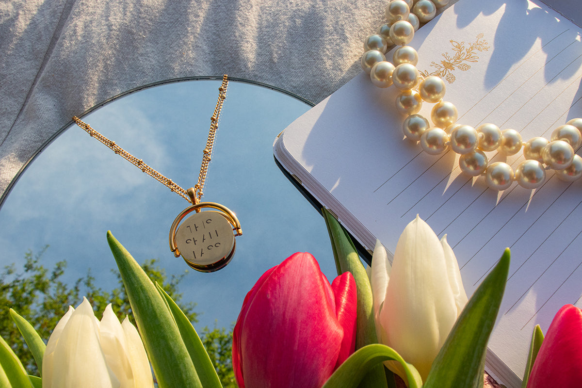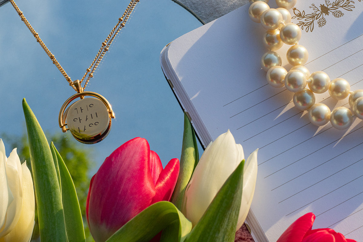 A beautiful 18K gold plated stainless steel pendant and chain that features a hidden message and can be seen when it spins.